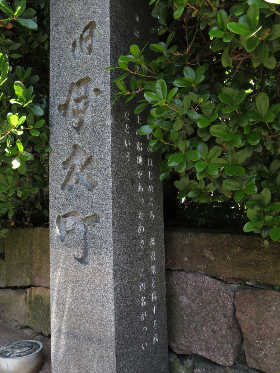 浅野川と彦三町(ひこそまち)、尾張町とを結ぶ道のすみっこに立っています。生垣にすっぽりと覆われているのが特徴的。